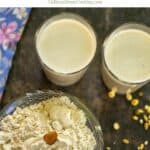 - For Sweet Kanchi, add 2 cups of lukewarm milk and jaggery or sweetener of your choice and mix well without any lumps and enjoy warm or cold.