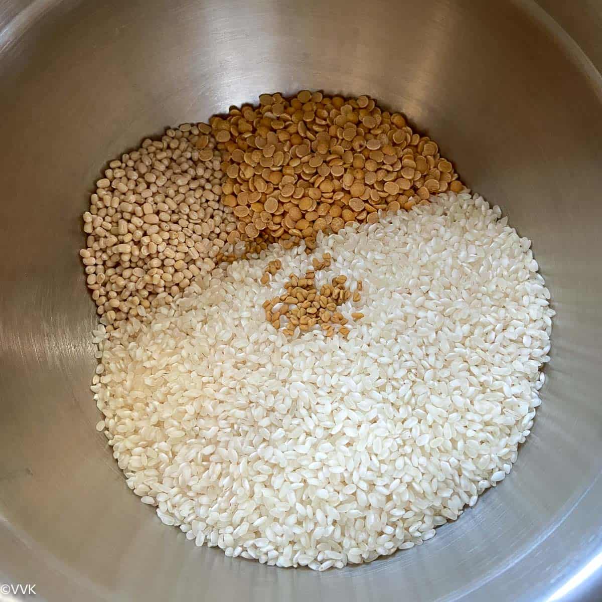 - In a bowl, take the idli rice, raw rice, toor dal, urad dal, and fenugreek seeds.