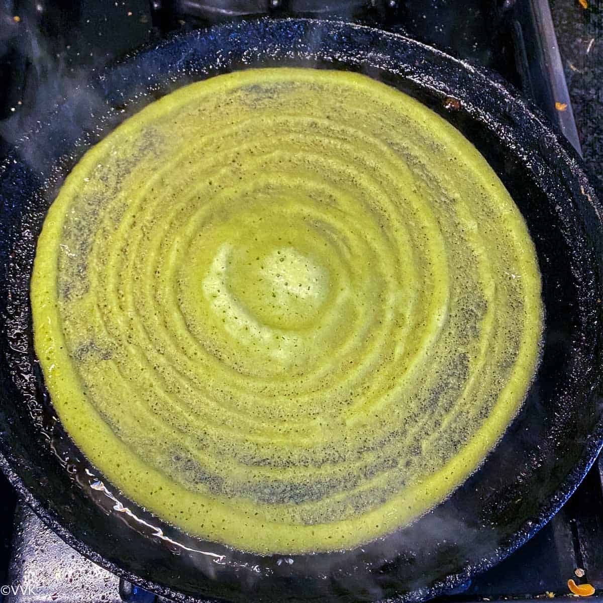 - Heat a well seasoned cast-iron pan, and when it is hot, reduce the heat to medium-low. Take a spoon/ladle full of batter and pour it on the pan. Spread it thin for crispy dosa. Spread some oil around the edges; ½ tsp should be sufficient. Let the top side cook.