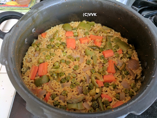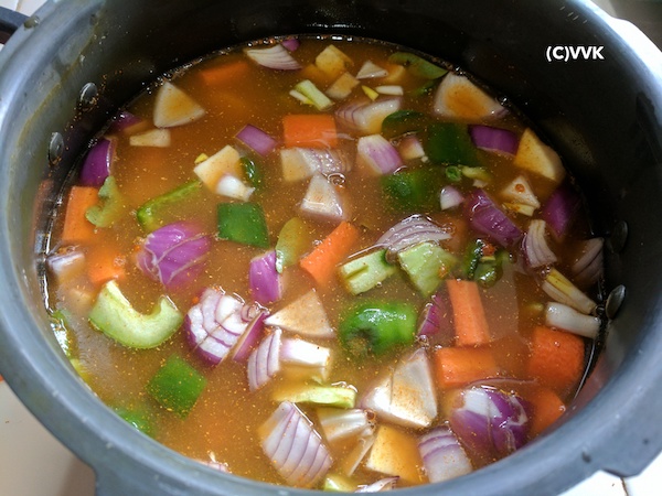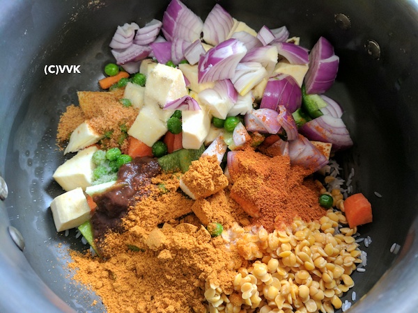 - Add the vegetables, onion, washed rice, toor dal, turmeric powder, vaangi bath powder, sambar powder, jaggery, salt, water, tamarind water, curry leaves and cilantro to the pressure cooker. Add everything given under ingredients. :-)