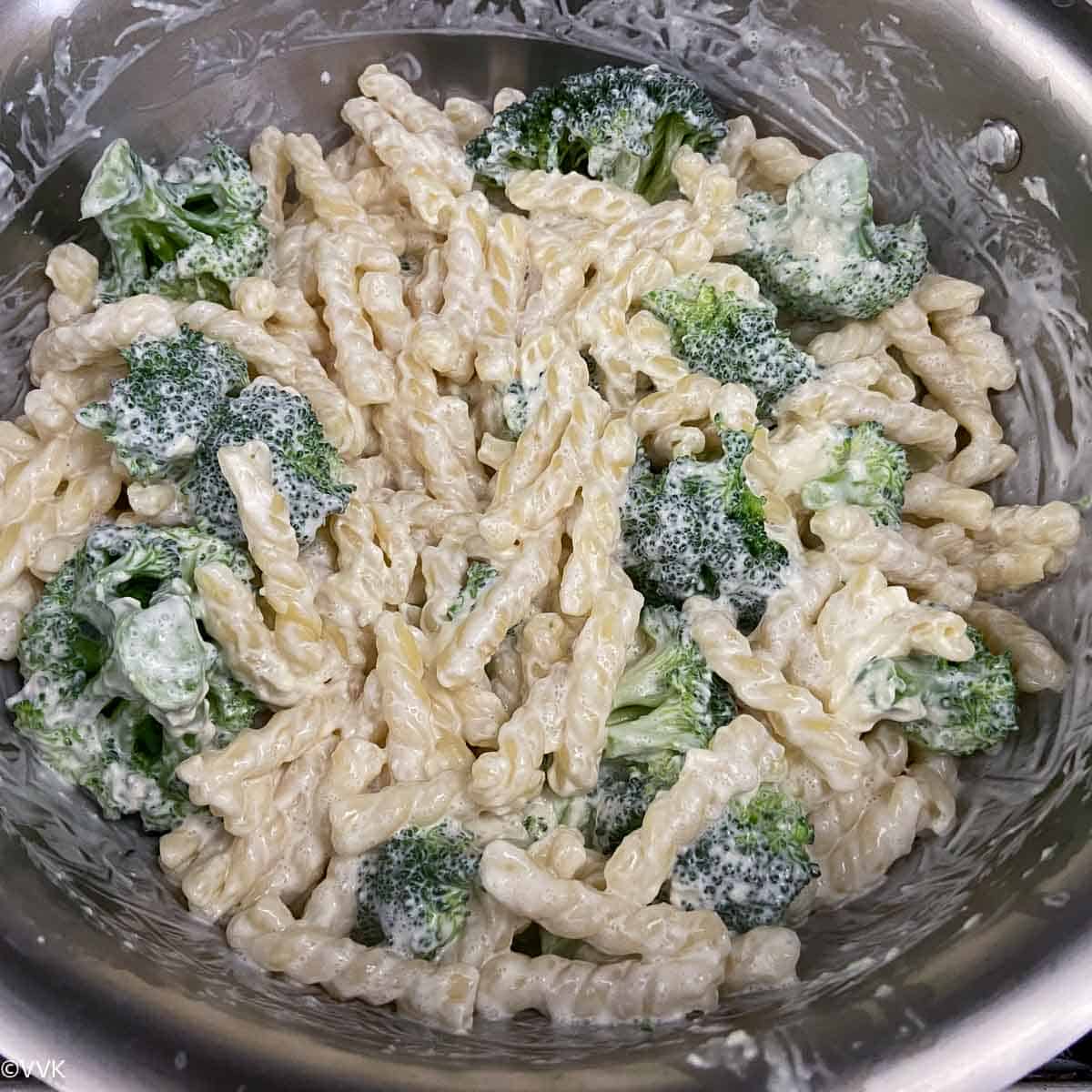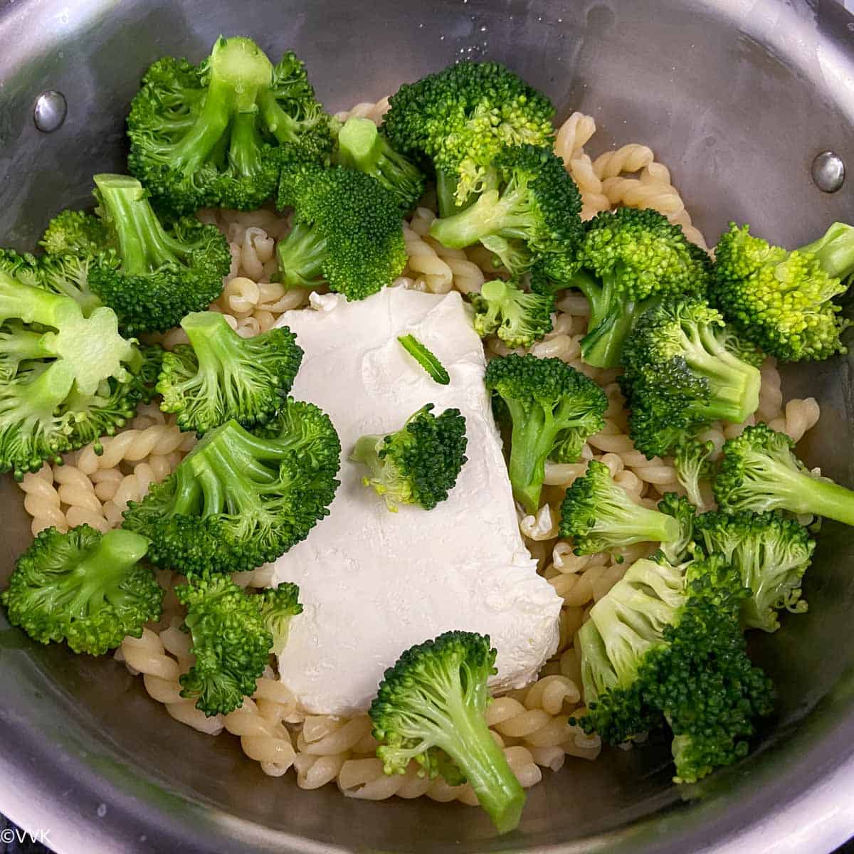 - Reserve ¾ to 1 cup of pasta water and drain the remaining water. Immediately transfer the drained pasta to the sauce pot, place the cream cheese on top, and add the broccoli florets. Cover the sauce pot and let it sit for 5 minutes – no need to turn the heat on. This step is very important. Do not let the pasta cool. The cream cheese block softens quickly when the pasta is hot.