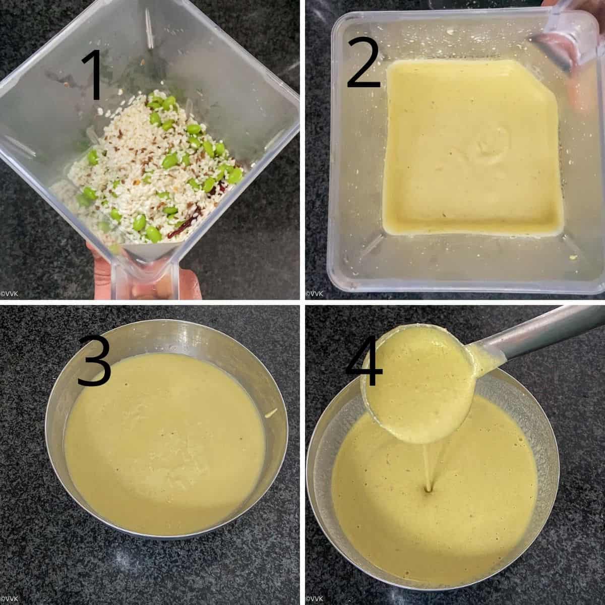 - Pic1 – After 6 hours, drain the water. Add ¼ cup of water to the blender and add the edamame and rice into the mixer jar. I made the batter in one shot and did not divide it into batches as I went with a small quantity.