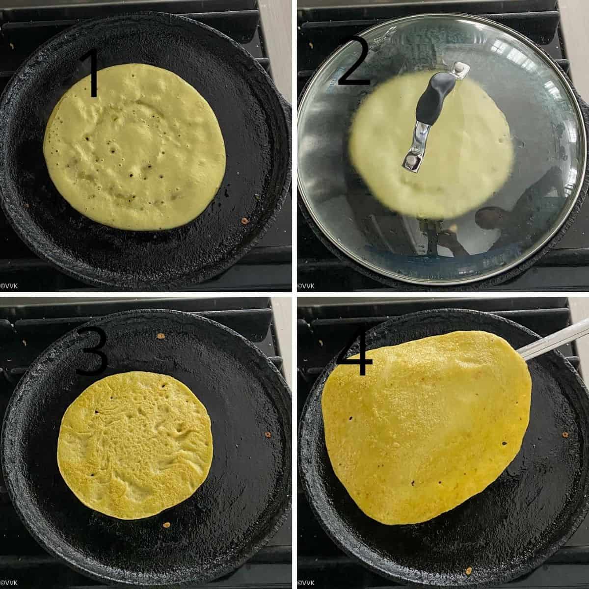 - (Pic 2) Cover it with the lid and let the edamame dosa cook in the steam. It usually takes approx 60 to 75 seconds. The timing is approx; make sure the top side is well cooked.