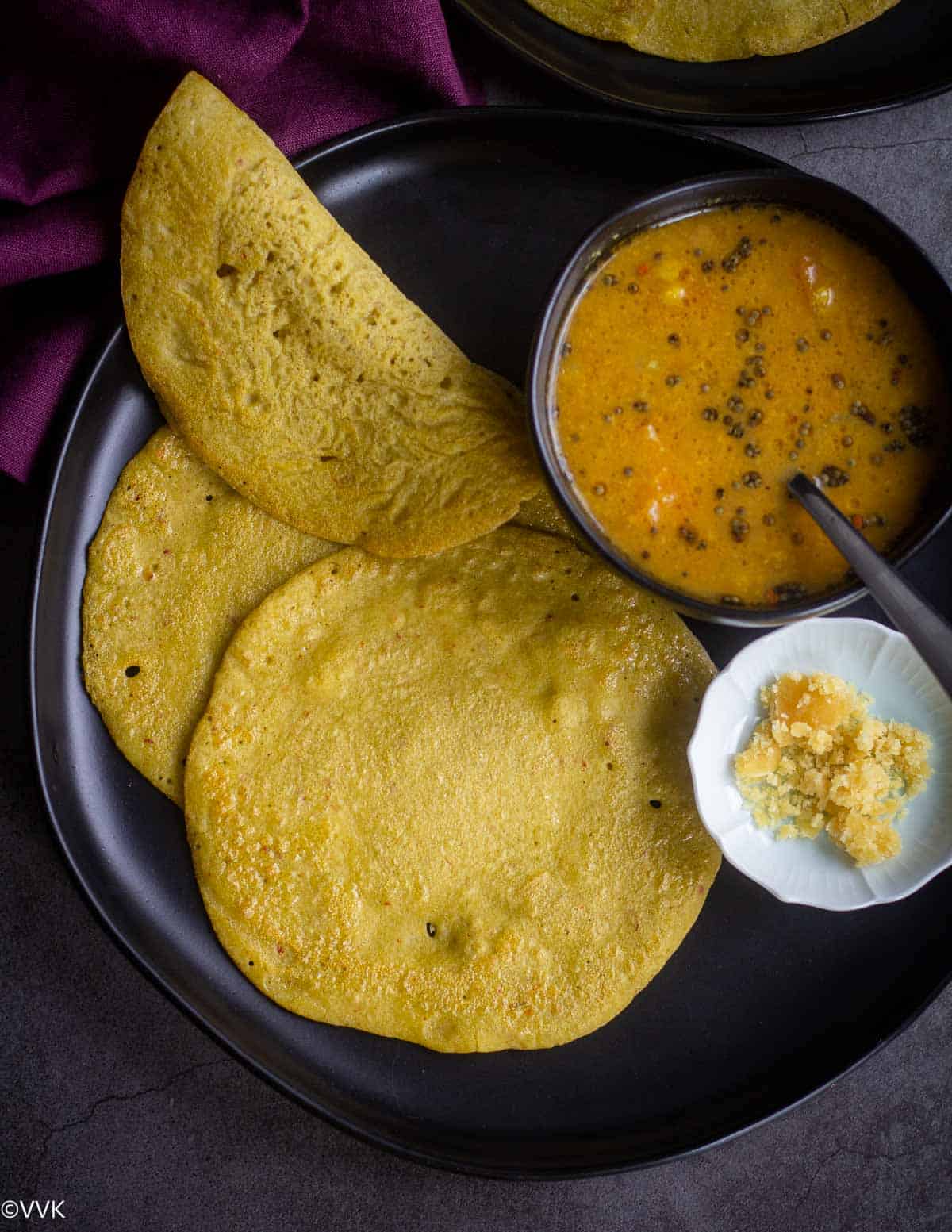 With the addition of cumin seeds and dried red chilies, the dosa is delicious on its own without any sides. You can relish it with butter or ghee. Use vegan ones if you are following a vegan diet. You can also serve it with jaggery. I served it with sambar and jaggery.