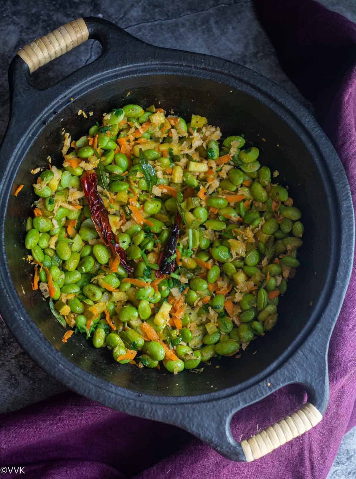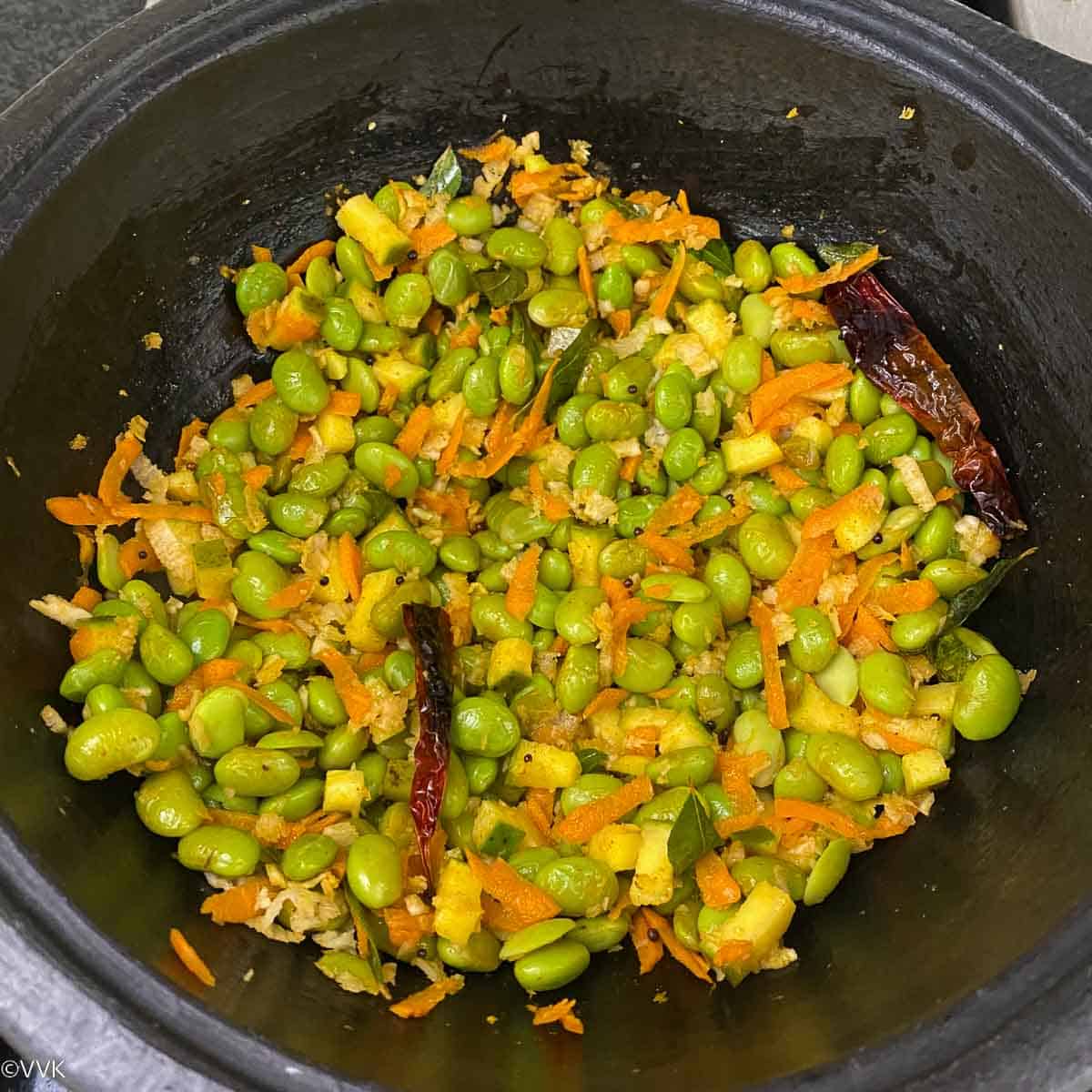 Every year I try to make some different sundal or add a simple twist to the regular ones like adding ground peanuts or freshly ground spice. This year, I am glad to share this edamame sundal recipe. It’s more like my green peas sundal/thenga manga pattani sundal.