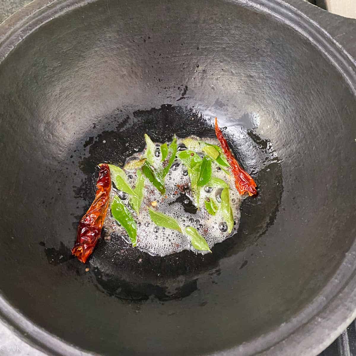 - Heat a pan or kadai and add the oil. When the oil is hot, add the mustard seeds, red chilies broken into small pieces, asafoetida, and curry leaves. Let the mustard seeds splutter.