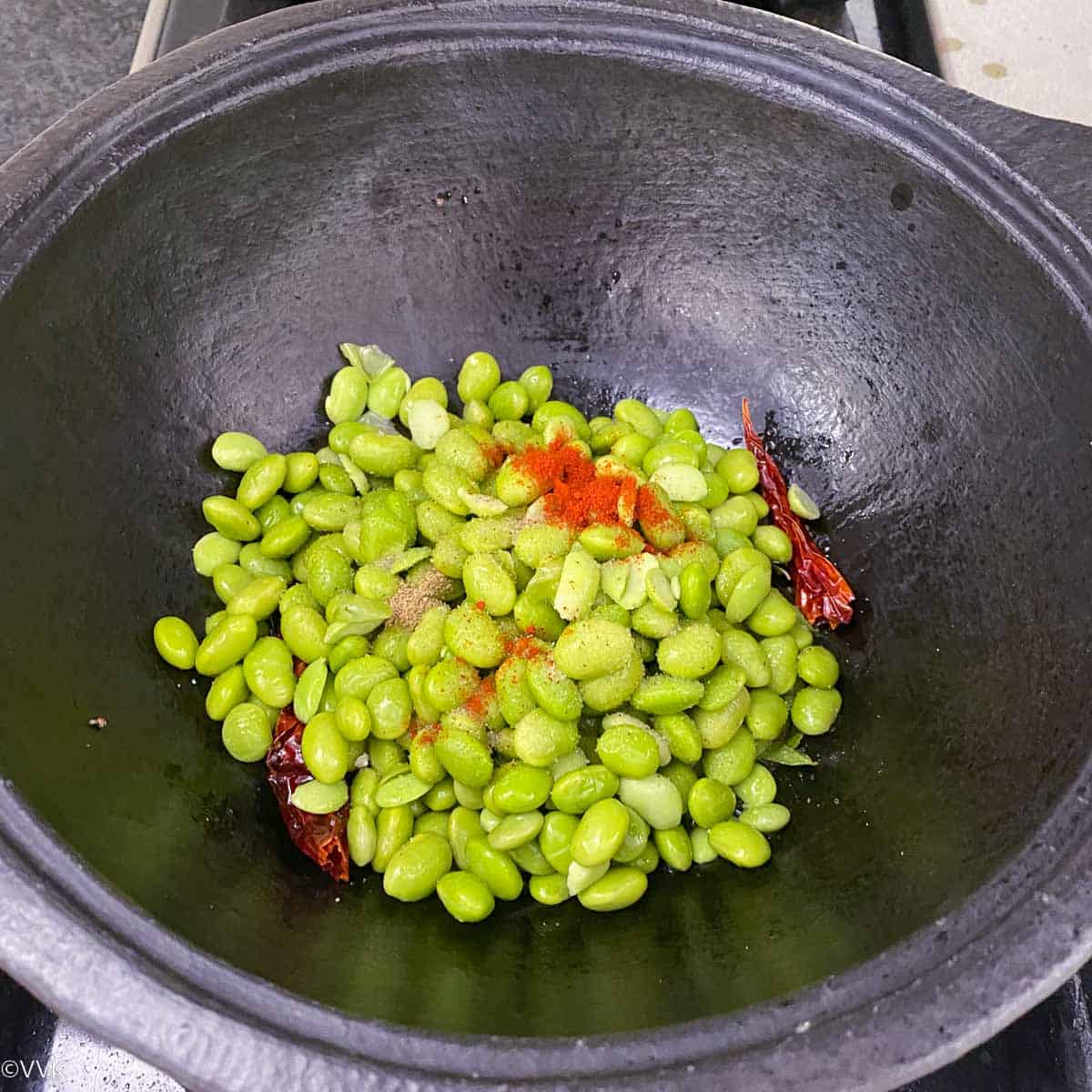 - Then add the edamame, salt, red chili powder, and chaat masala. Mix well and cook for a couple of minutes.