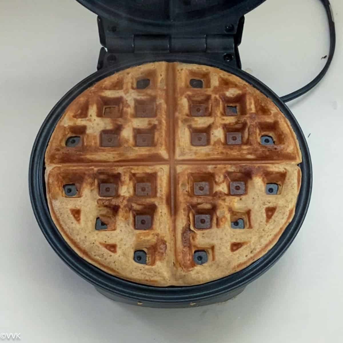 - Preheat the waffle maker. I usually keep it in my medium setting. (This is the waffle maker I have). Pour the batter into the preheated waffle iron and close it. I usually cook mine for 6 to 7 minutes. Make the waffles as per the manufacturer’s instructions and adjust the timing as per your texture preference. (crisp or soft)