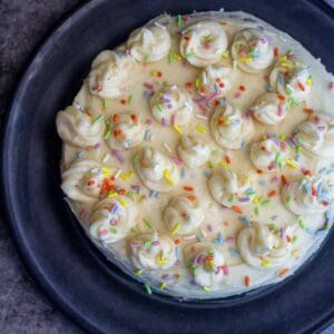 This carrot cake is egg-free, but it does contain nuts and dairy. Because the cream cheese frosting is perishable, it’s best stored in the refrigerator. I usually keep it in an airtight container or cake box. It stays fresh for about 5 to 7 days in the fridge.