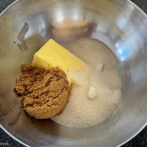 - In a mixing bowl, add butter, brown sugar, and white sugar.
