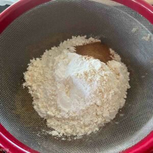 - Sift in all-purpose flour, cinnamon powder, and baking powder.