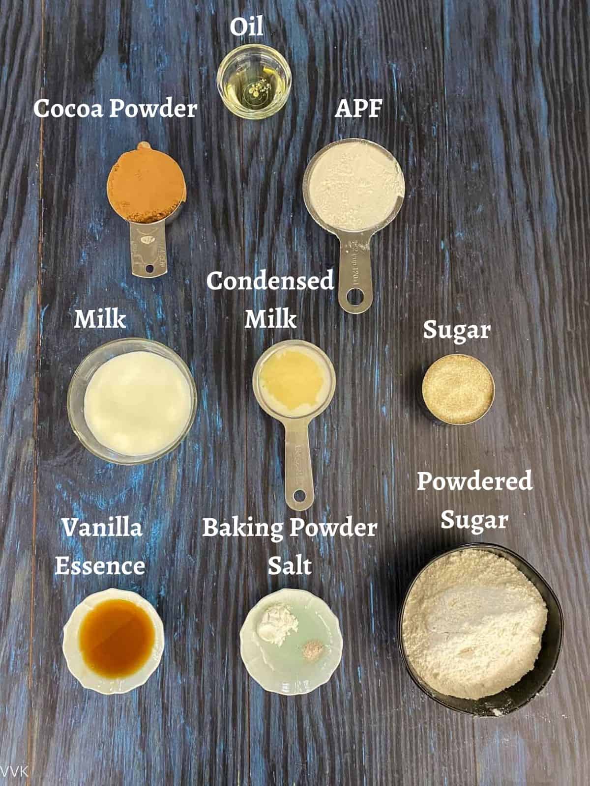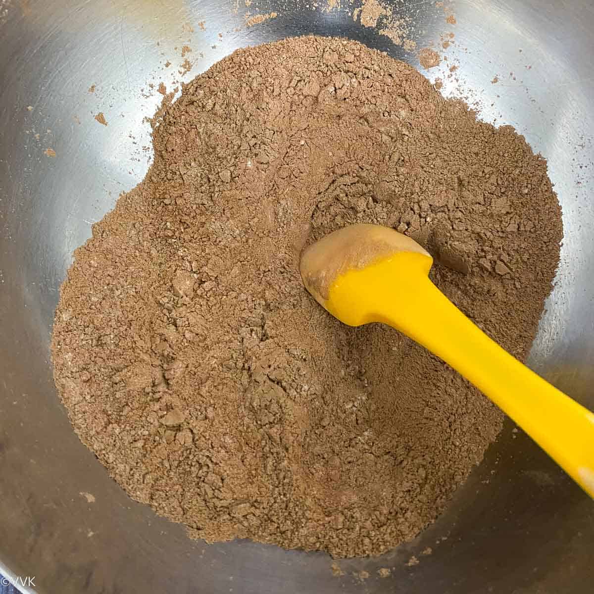 Dry ingredients – I have used organic all-purpose flour and unsweetened cocoa powder for the chocolate flavor. You can also use regular all-purpose flour or wheat flour. Along with the flour and cocoa, we need baking powder and a pinch of salt.