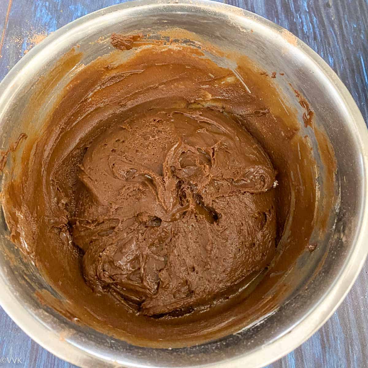 - I used two bowls to make this cookie dough. But you can make it in the single bowl too. You can mix the wet ingredients and directly sieve the dry ingredients into the wet mixture. Gently mix and make sure the ingredients are well combined.