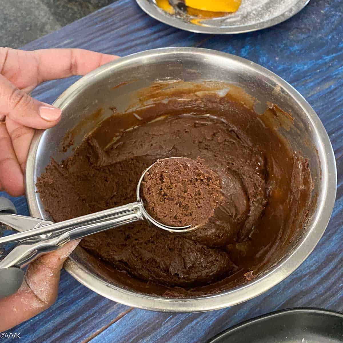 - Preheat the oven to 350 deg F and line a baking tray with parchment paper. After 30 minutes of refrigeration, take the dough and scoop 1 to 1.5 tbsp of cookies using a cookie scoop or ice cream scoop.