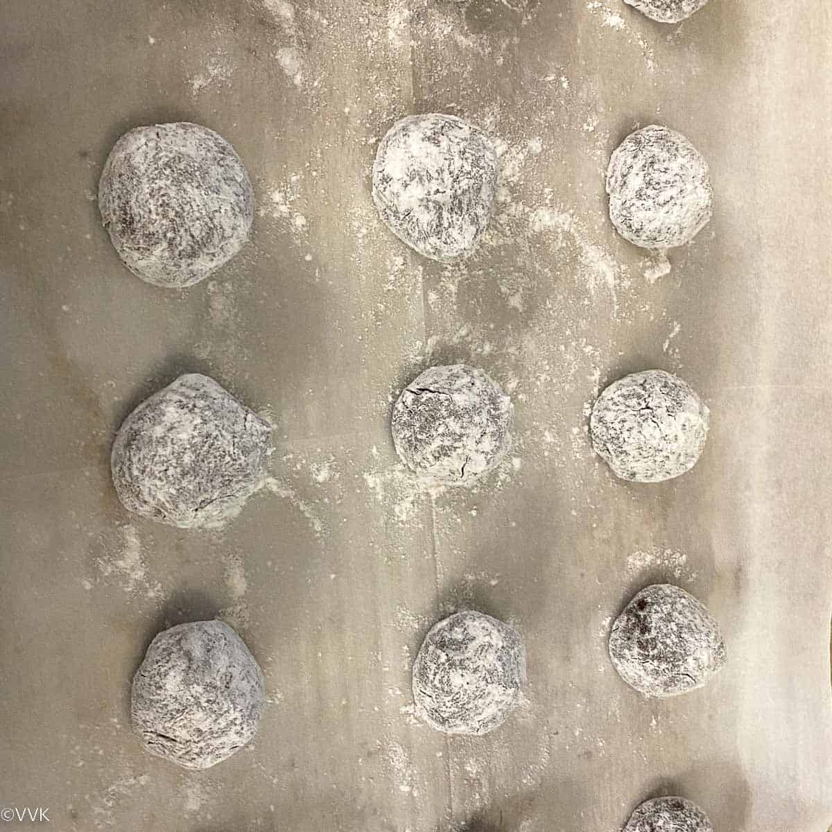 - Place the sugar-coated cookies in the baking tray lined with parchment paper. Similarly, scoop out the cookies with the remaining dough and coat them with sugar and line them in the baking tray.