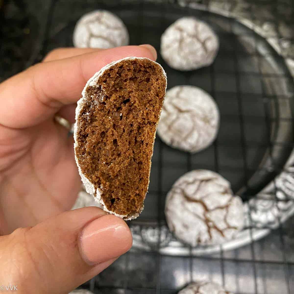 - Let it cool before transferring it to an air-tight container. Here is the soft and fudgy inside of the crinkle cookie.