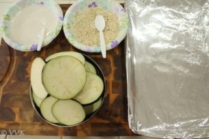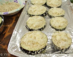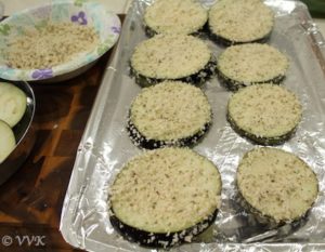 - Dip the eggplant slice on both sides in almond milk and dust it generously with panko crumbs. (If using APF, after dipping in almond milk, dust it with flour before panko. As I didn’t use APF, I used a generous amount of panko)