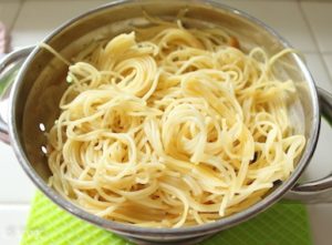 - I first added the spaghetti and then added a ladle full of red sauce on top.