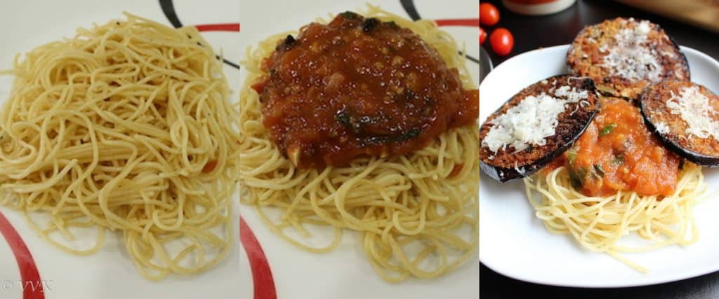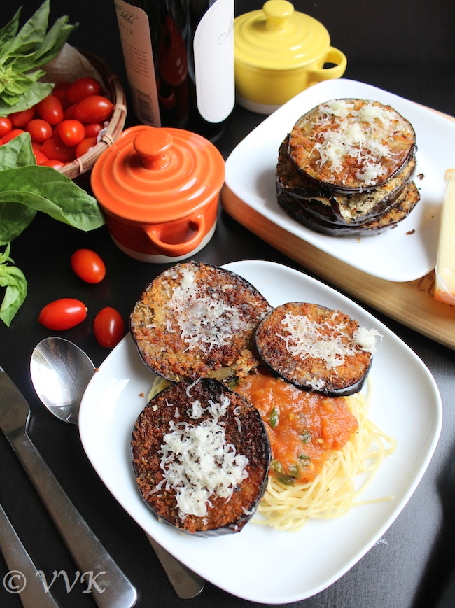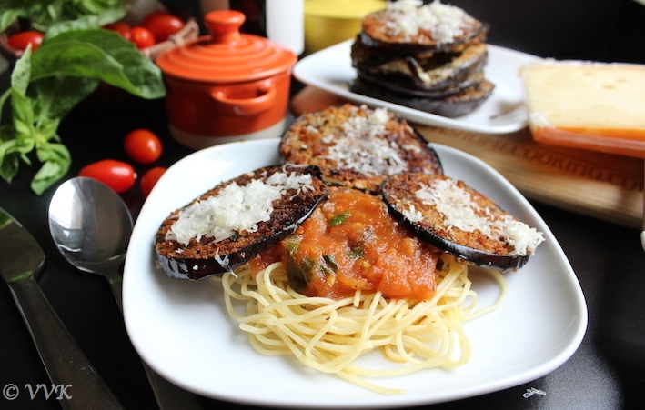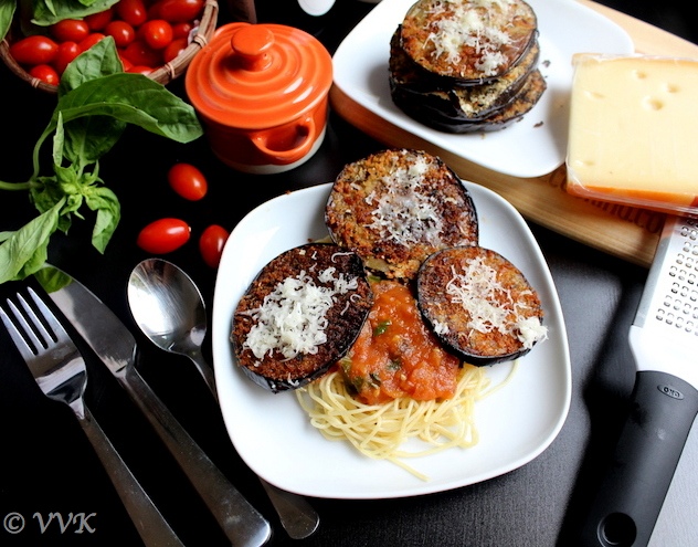 Eggplant Parmigiana or Eggplant Parmesan is one of the classic and unique Italian recipes. It is one of the staples in all the Italian restaurants. It is prepared with shallow or deep fried eggplant or aubergine slices and topped up with cheese and tomato sauce. Today I am presenting this eggless eggplant parmigiana and I am serving this along with spaghetti as they serve in restaurants. So here is the restaurant style, eggplant parmigiana but without eggs.