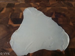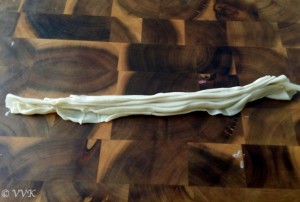 - Roll the dough as thin as possible and like paper fan start folding them. (Inside and outside folds see the picture above) and stretch it a bit. The gluten content helps to stretch.