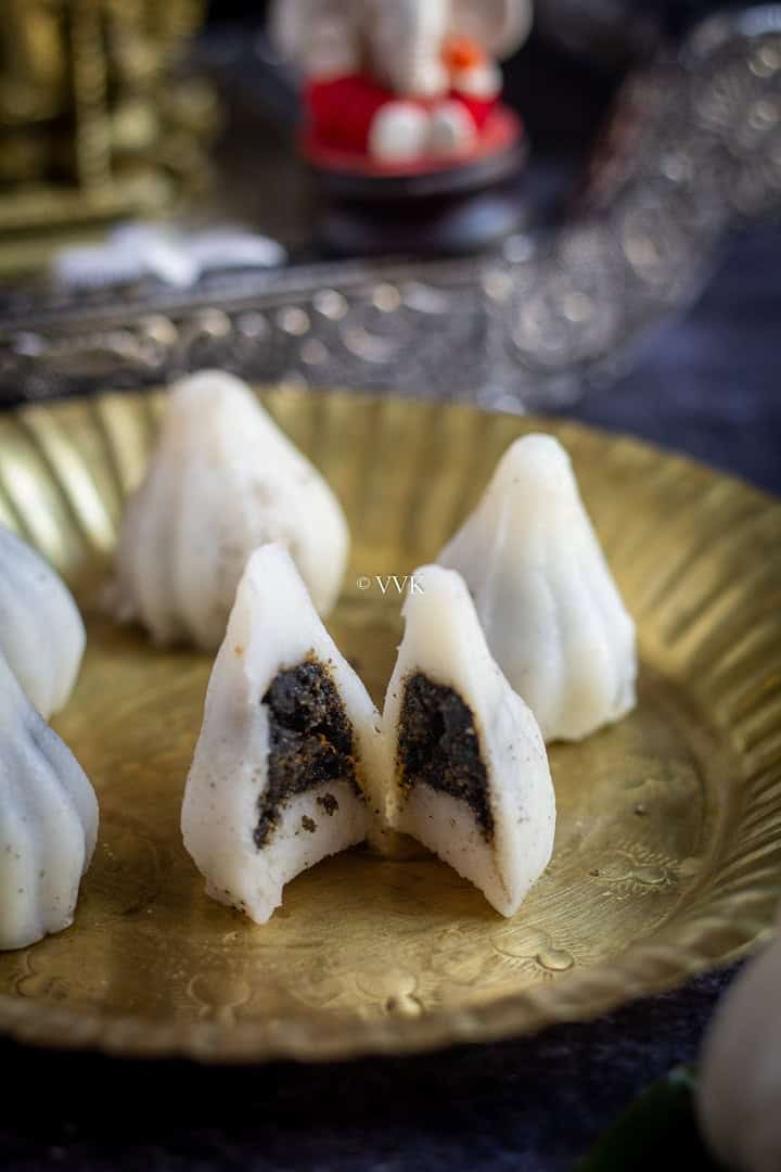 Ellu Kozhukattai – Steamed sweet dumplings stuffed with sesame seeds and jaggery mixture offered as prasadam or neivediyam during festivals. Here is my recipe for kozhukattai with store-bought rice flour.