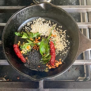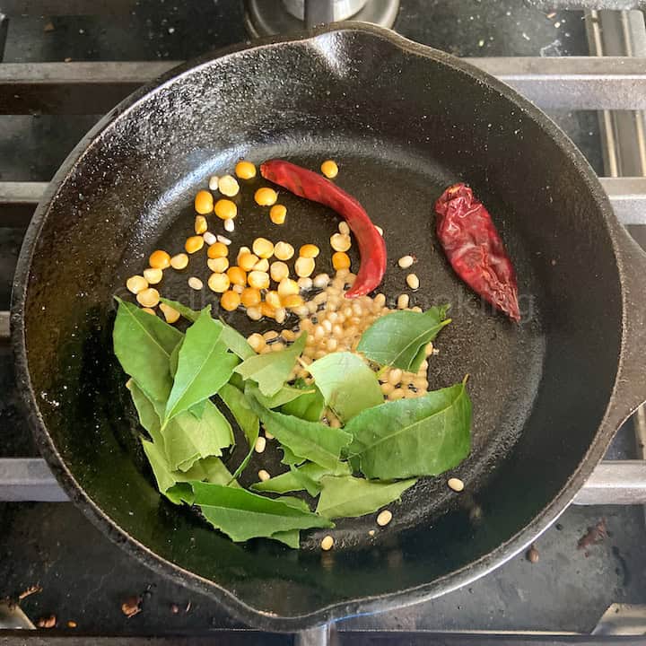 - Heat a pan or kadai and add the ½ tsp of oil. When the oil is hot, add the mustard seeds, urad dal, chana dal, dried red chilies, and curry leaves.