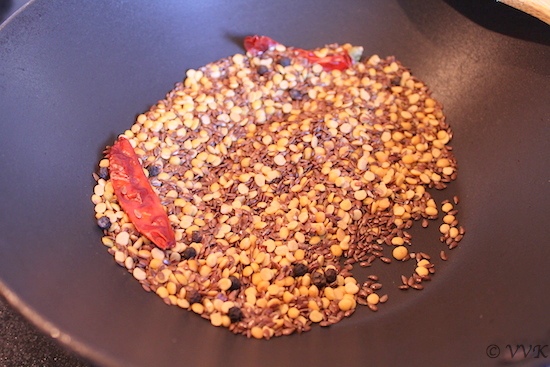 - Heat the kadai. Once it becomes hot, add the toor dal and flaxseed.