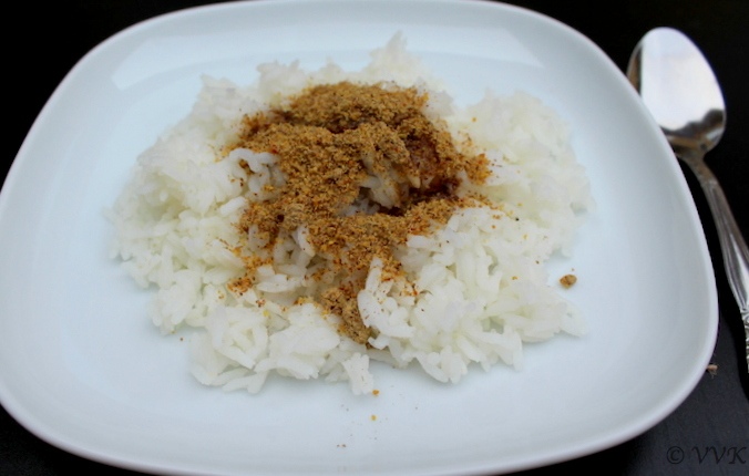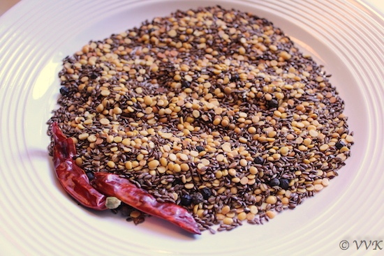 All you need to do is dry roast the ingredients and grind it. It has a shelf life of about ten days when refrigerated. Rice and this podi with a dollop of ghee served with papad is a complete meal by itself.