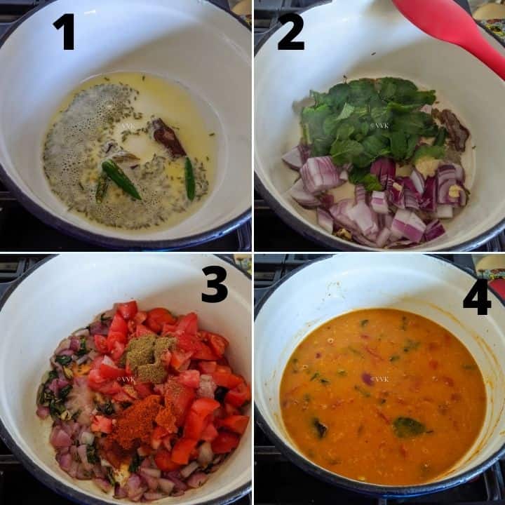 The recipe is simple and straightforward. We first temper the whole spices in oil and ghee. Then saute the onions along with mint. We then add tomatoes and spice powders and cook until the tomatoes are soft and mushy. Finally, we add the water and cook the millet.