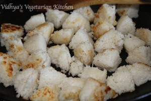 - Heat 1 tbsp of oil and fry the idly pieces till they turn to light brown color as shown in the picture below.