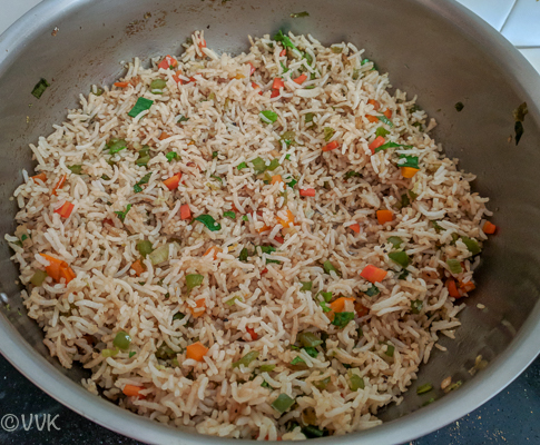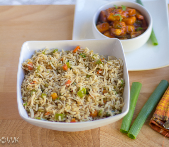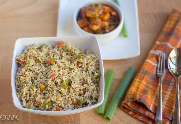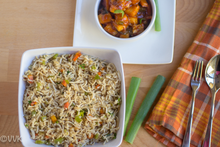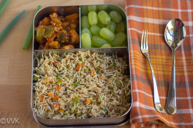 A perfect lunch box recipe that pairs well with paneer Manchurian. You need pretty basic ingredients to prepare this mild veggie fried rice and here is how I made it.