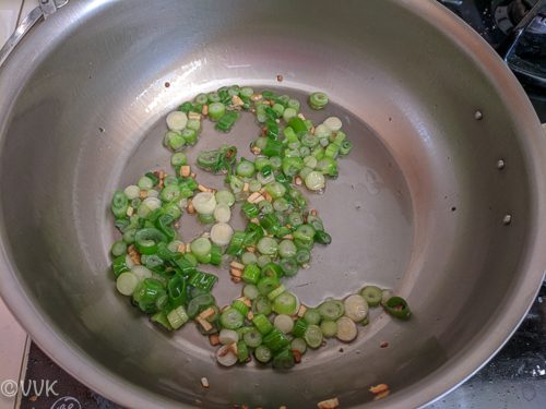 - Heat the wok or kadai ( I used my copperware for this) and when it is hot add the oil. Make sure you cook over a high flame. We are going to flash cook all the veggies. Hence high heat is vital.