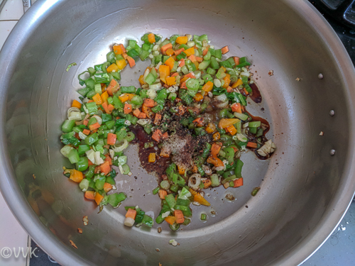 - We need the veggies to be crunchy, so after two minutes add the sauces and condiments. So add the salt, sugar, soy sauce, pepper and stir well.