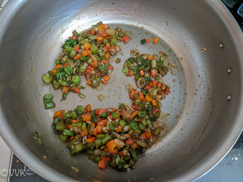 - Chop all the vegetables into small pieces and set aside 1 tbsp.