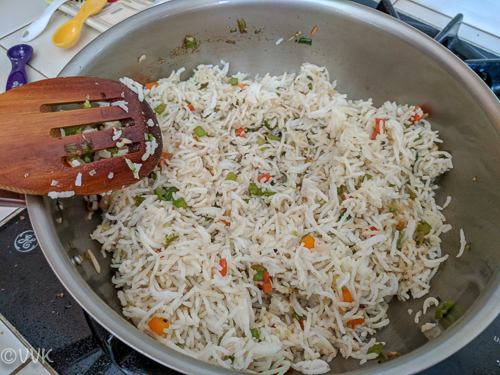 - Cook the combined rice and veggie over high heat for a couple of minutes and that's it. Turn off the heat.
