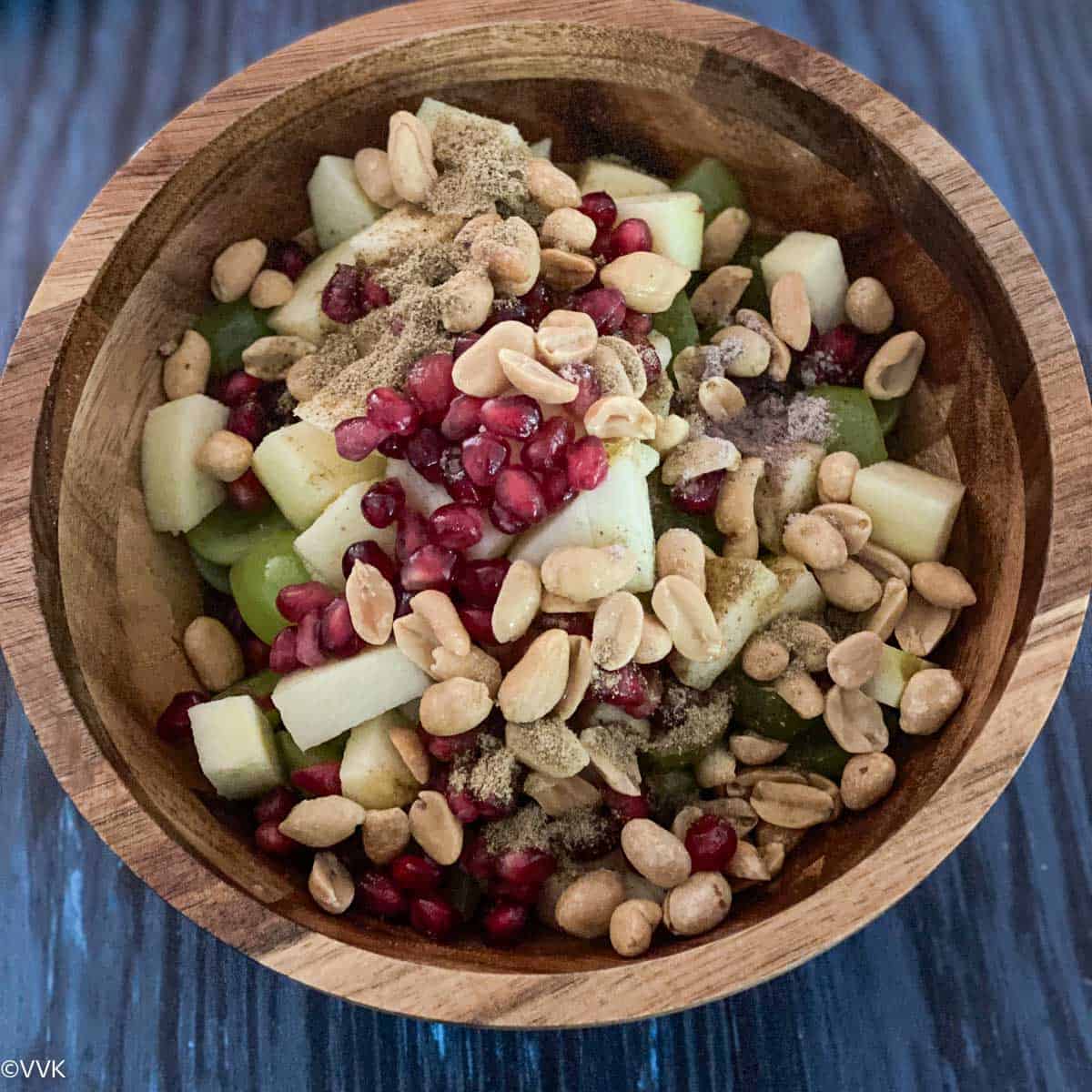 - For a chilled version – Mix the chopped fruit and vegetables and add the lemon/lime juice; refrigerate them for 20 to 30 minutes. Before serving, add the spices and peanuts. Mix well and enjoy.