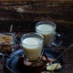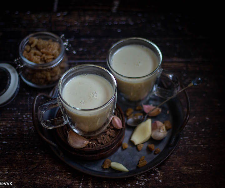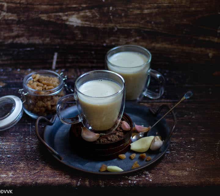 Garlic milk – A healthy drink with lots of garlic and milk sweetened with palm sugar candy! A natural home remedy for various ailments and a perfect drink for lactating moms.