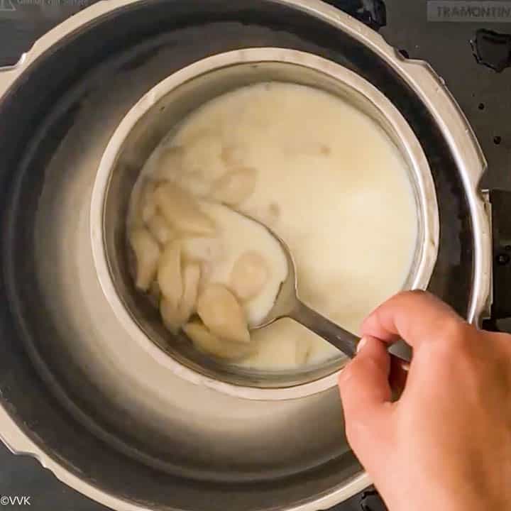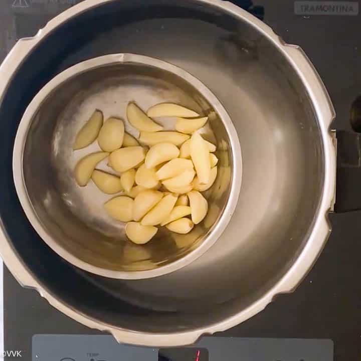 - Close the pressure cooker and cook for up to three whistles/hisses. Let the pressure release naturally and open the pressure cooker. The garlic should be soft and mushy.