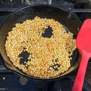 - Roast until the urad dal turns deep/reddish golden brown. (In Tamil, we say sivaka varukanum) Note: Set aside a tsp of urad dal mixture(Just urad dal and mustard seeds) from this for adding it later. Instead of doing the tempering separately, we set aside some roasted mustard seeds and urad dal. You can prepare the tempering separately and add it later too. Tempering is optional for this recipe.