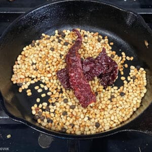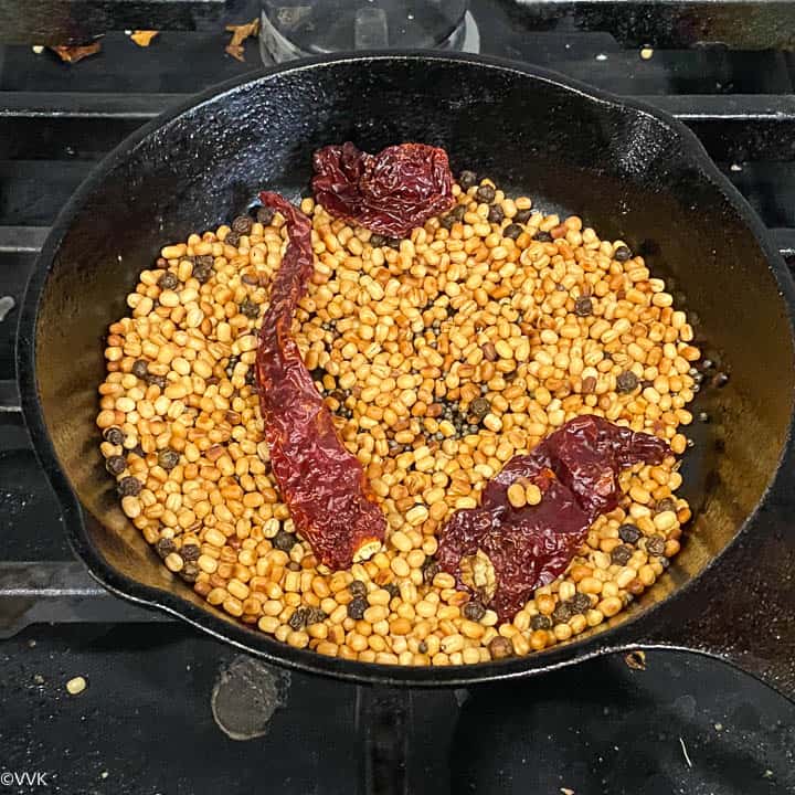 - Be cautious while roasting the urad dal. We need to roast till it turns deep golden brown, but don’t let it turn dark brown/black. It alters the taste. If you are using a cast-iron pan, the residual heat might affect, so transfer the lentils to a plate after roasting them.