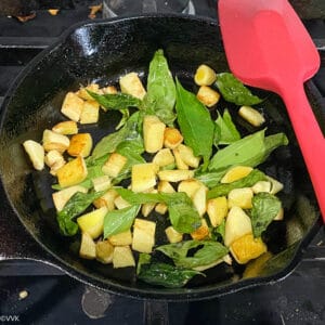 - Set aside this dal mixture and now in the same kadai, add the remaining oil and sauté the chopped ginger and curry leaves for 3 to 4 minutes till the ginger becomes tender.