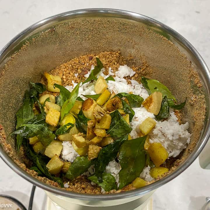 - Let the urad dal mixture and ginger cool. Now transfer the dal mixture to a mixer jar and grind it first. Then add the sauteed ginger, coconut and curry leaves, tamarind paste, and salt.