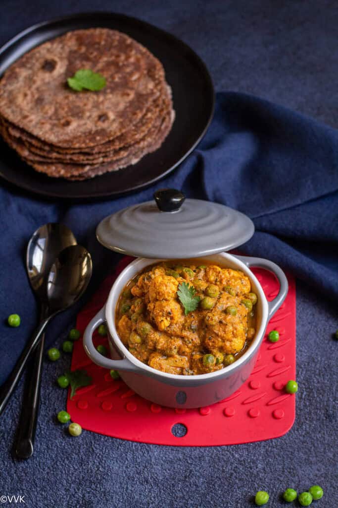 This gobi mater is a vegan, gluten-free, and nut-free dish. This curry goes well with roti, naan, and kulchas. You can also pair it with rice.