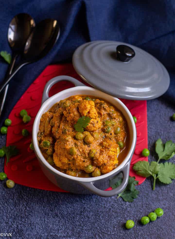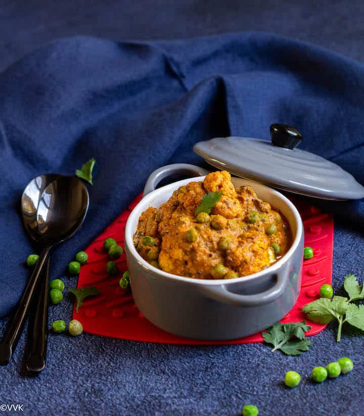 Now coming to today’s recipe, as mentioned before, this is my vegan take on the popular Indian dish – matar paneer. Okay, I have mushroom matar on my blog, but this cauliflower and peas curry is totally different. I did not use any onion or garlic in this recipe, and also it’s nut-free, and I didn’t add any cream as well. But hey, no compromise on taste, and that’s for sure!