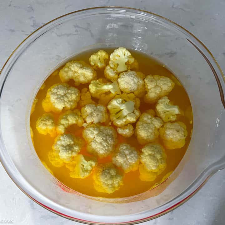 - Add the salt and turmeric powder to the hot water and mix well. Then add the cauliflower and let it sit for 15 minutes. Make sure the cauliflowers florets are fully covered with water. After 15 minutes, drain the water and set it aside.