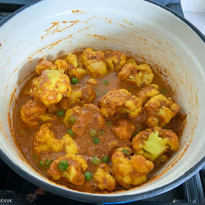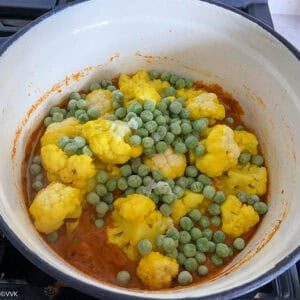 - Now add the cauliflower florets and peas. Add ¼ cup of water and mix well—cover and cook for 5 minutes over medium heat.
