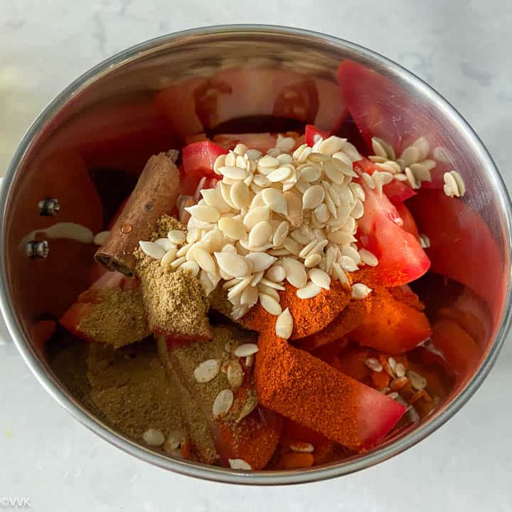 - In a blender or mixer jar, add the tomatoes, cardamom, cloves, cinnamon, red chili powder, cumin powder, green chili, and the soaked and drained melon seeds.