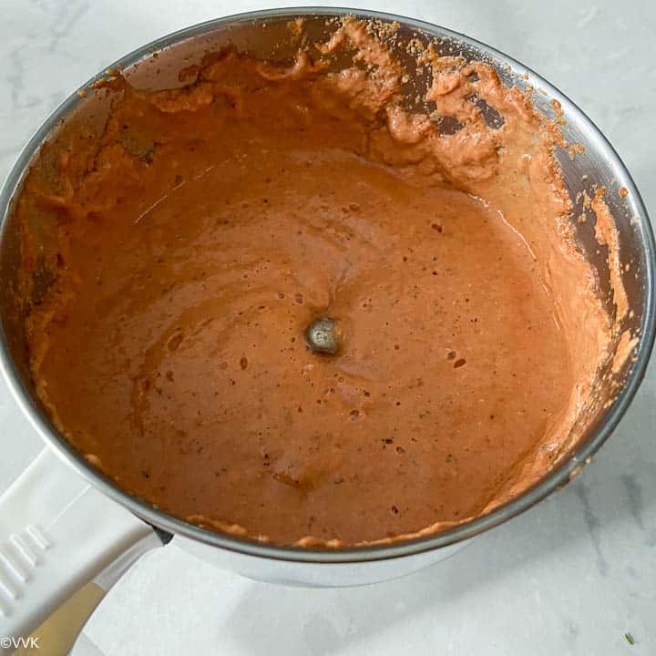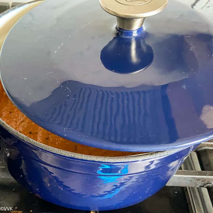 - Add salt and mix well. Cover the pan partially and cook for 7 to 8 minutes over medium-low heat. Mix it in between. The ground paste splashes out; that’s why we partially cover and cook.