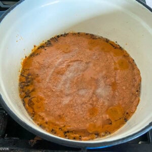 - When the spice mix sizzle and splutter, add the ground paste slowly and carefully. Rinse the mixer jar/blender with 2 more tbsps of water and add that too.