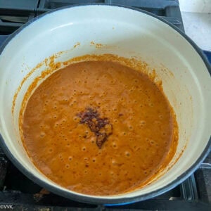 The dried melon seeds, tomatoes, whole spices make this curry delicious. You can find dried melon seeds in your local Indian groceries, but you can always use almonds or cashews if you can’t source them.